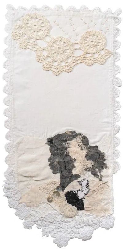 The valentine boxes and silhouettes by Moses Williams were crucial as they inspired the materials, paper cutting, and hand stitching I employed in the heirloom series. I began threading memories of the imagined homelife, ritual, and kinship bonds using vintage and antique textiles. I collected passed-down heirlooms, materials such as handkerchiefs, lace, and buttons to create vignettes in silhouettes.